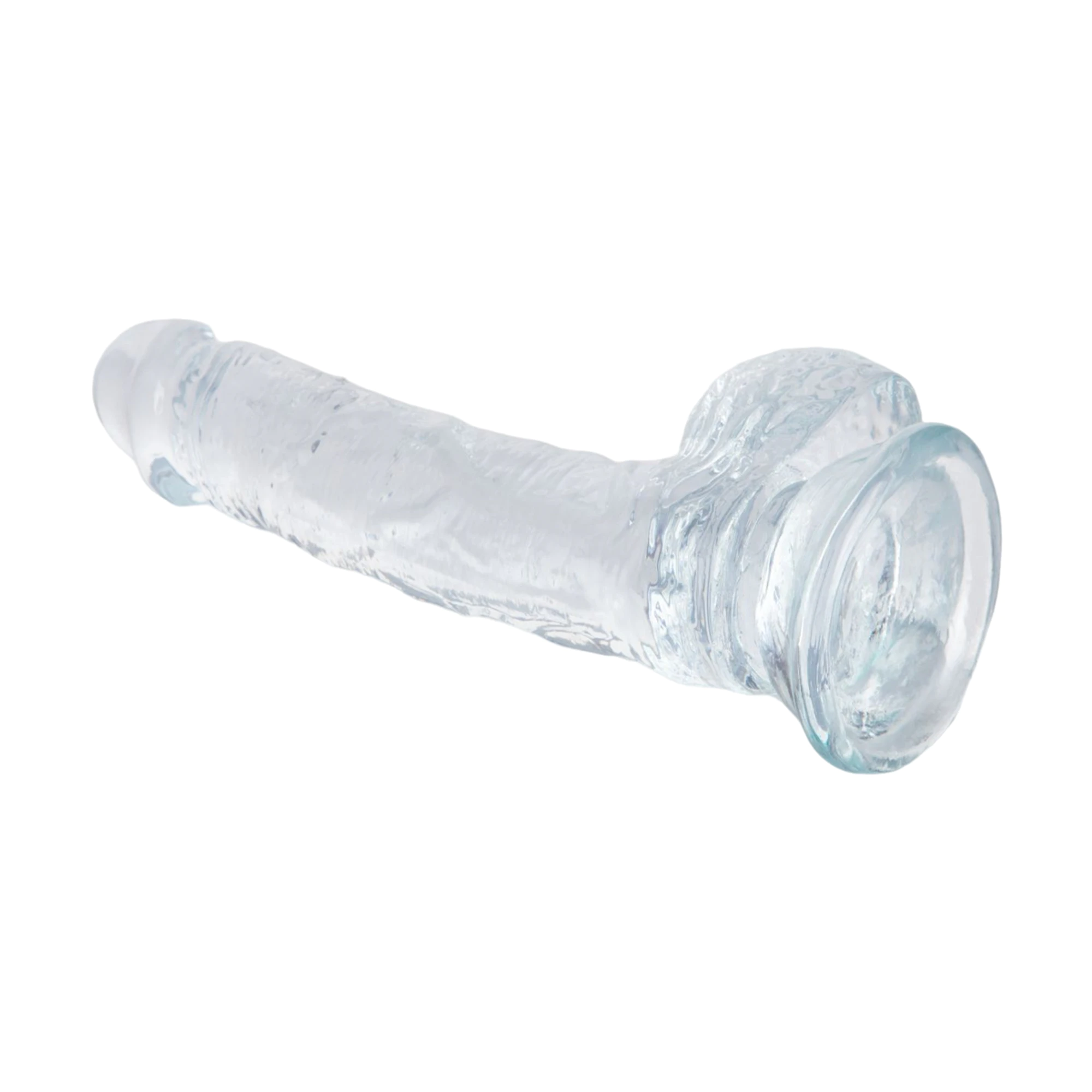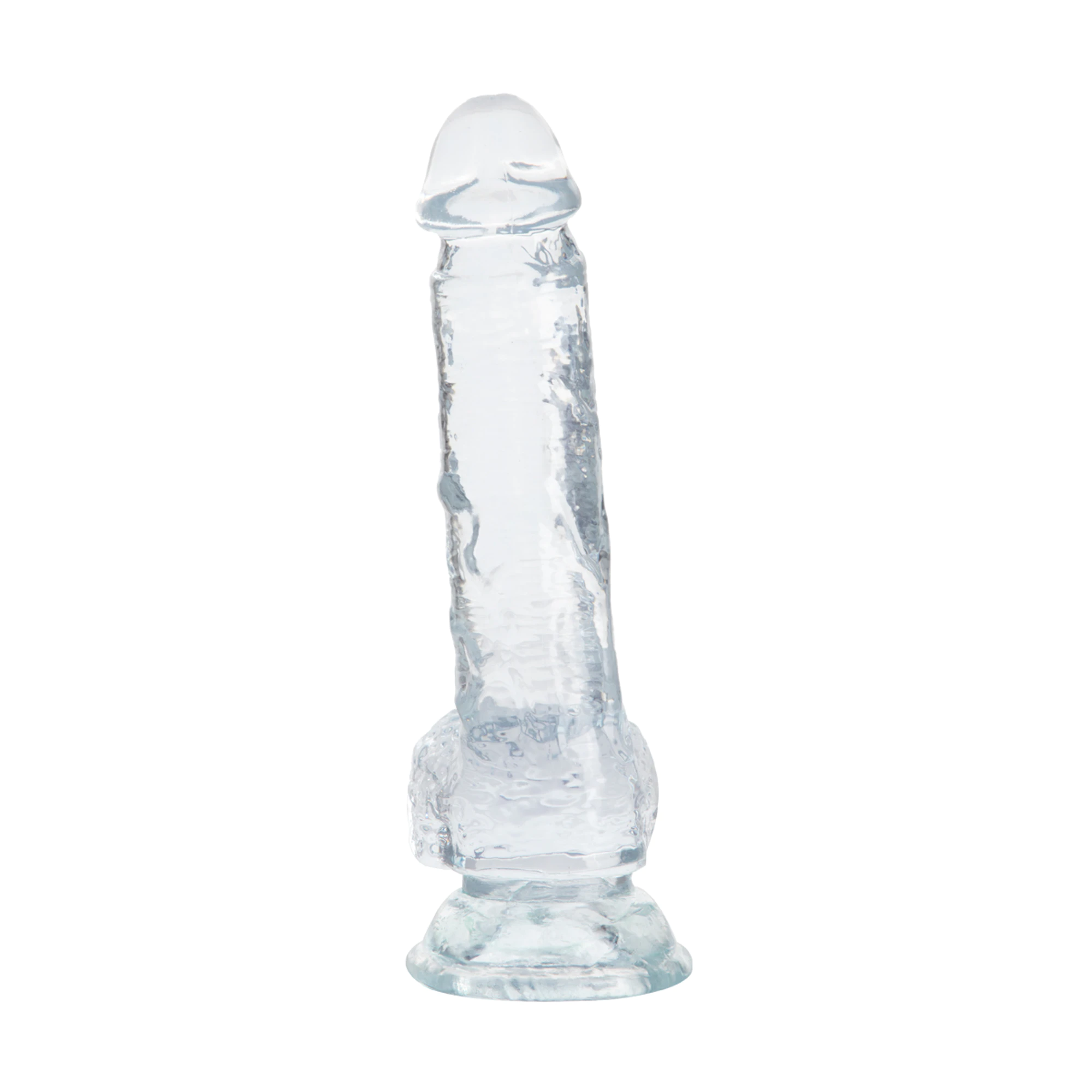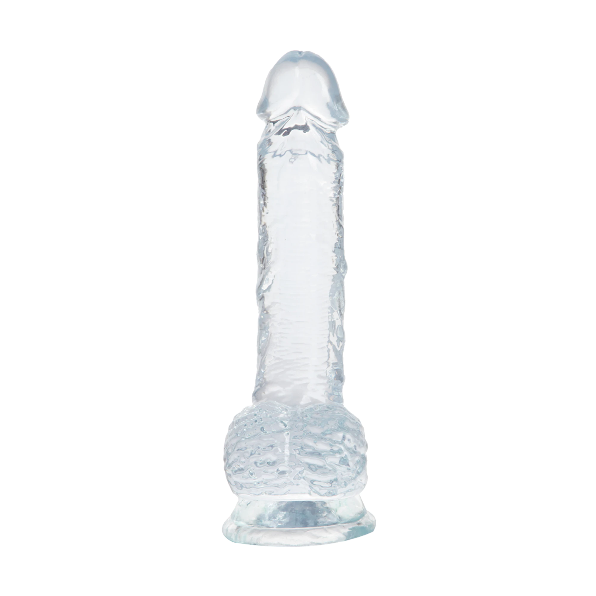 Dildo transparent de 20.5 cm, cu design realist, testicule și bază cu ventuză pentru fixare stabilă. Ideal pentru utilizare solo sau în cuplu.