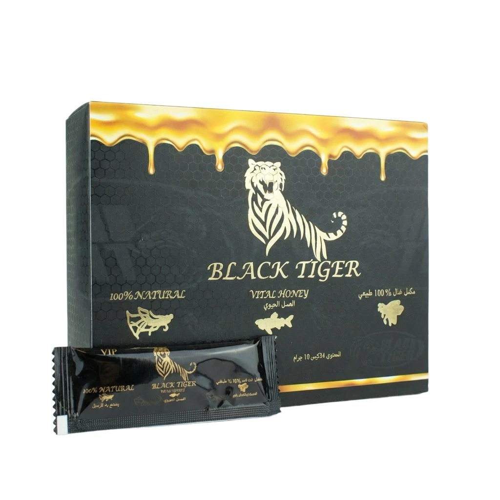 Miere afrodisiacă Black Tiger în 24 plicuri individuale de 10 g, formulă premium pentru energie, vitalitate și susținerea performanței.